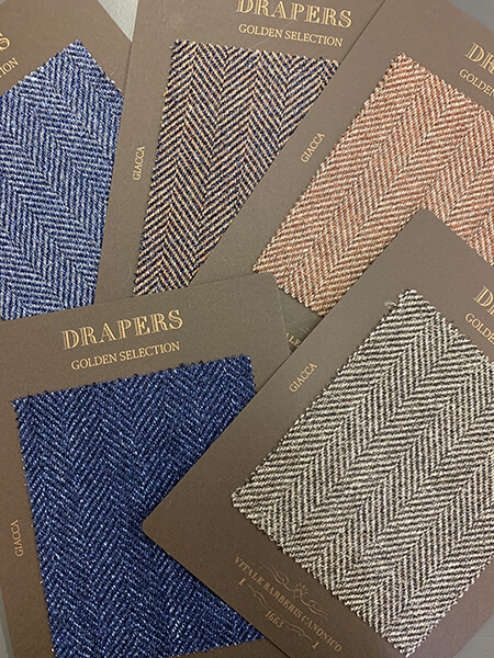 秋冬シーズンに向けた新しいコットンバンチのご提案です。色の豊富さにこだわってきたドラッパーズのアーカイブから厳選されたカラーバリエーション、ストレッチの効いた着心地の良さが特徴のコレクションです。ソラーロ風のヘリンボーンはコットン100%で、長くお付き合いいただけるように2PLYのしっかりとした糸で織られています。