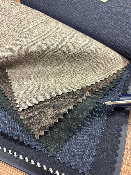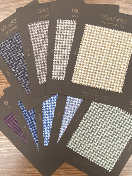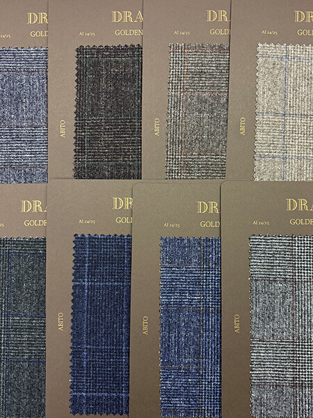 毎シーズンのトレンドの商品から斬新なカラー・デザイン・素材を選択し提案しているゴールデンセレクション。2024秋冬の新しい提案として、ウール、カシミア、シルクを用いた210gのライトウェイトのフランネル生地(Art.90401~90416)をご用意しました。こちらは多くのカラーバリエーションを取り揃え、冬用のウィンタークオリティ-を保ちながら軽さを出すことに重要視を置いて作られたスーツ素材になります。更には、サキソニー生地を時代に合わせてよりスポーティなものとして着用できるようにレスフォーマル、レスクラッシック素材(ステファノ社長はメノフォルマーレ、メノクラシコと凄く強調していました)Art.90417~90437を新提案として加えております。また、スプーニャ/スポンジルック(Art.90463~90468)やヘリンボーン柄のジャージー素材(Art.90482~90486)等、全103色の多彩でバラエティに富んだDRAPERS社2024秋冬コレクションをご堪能ください。